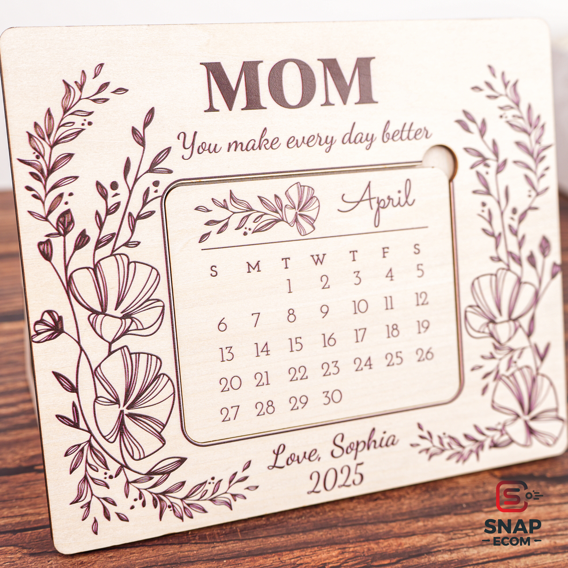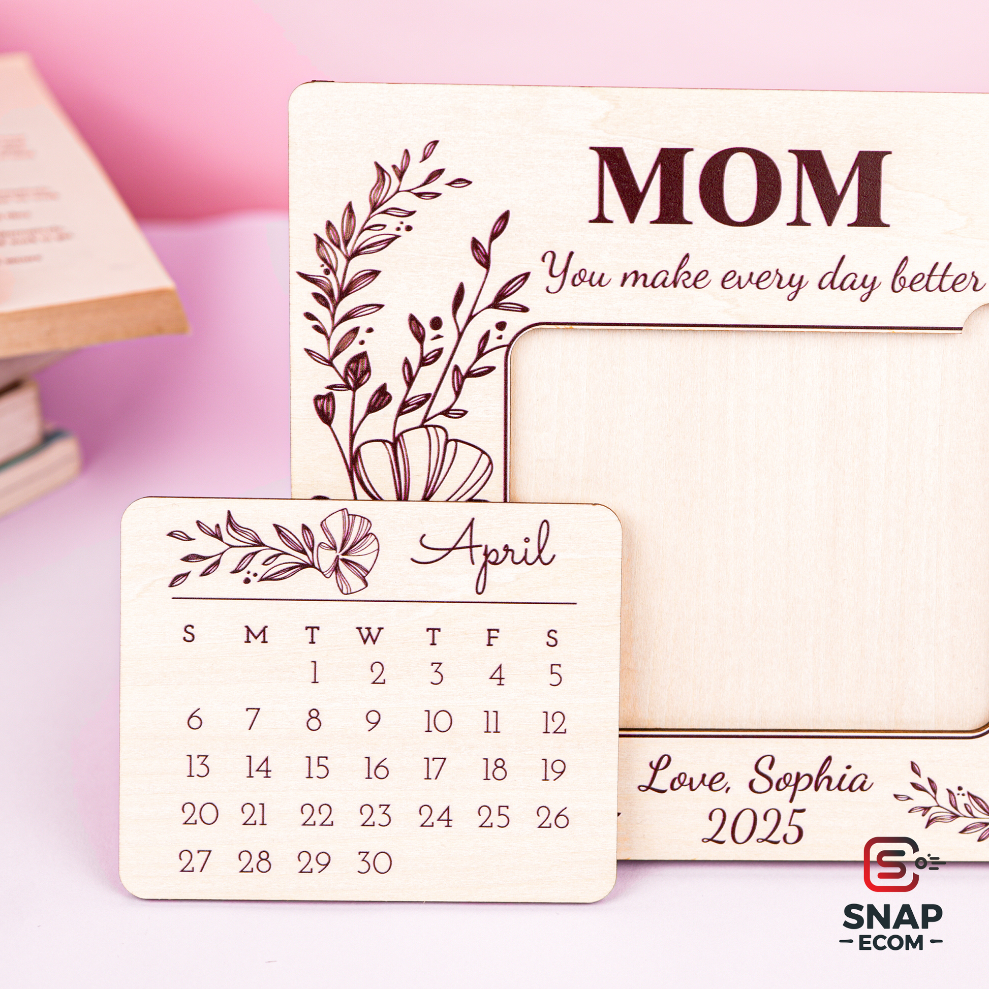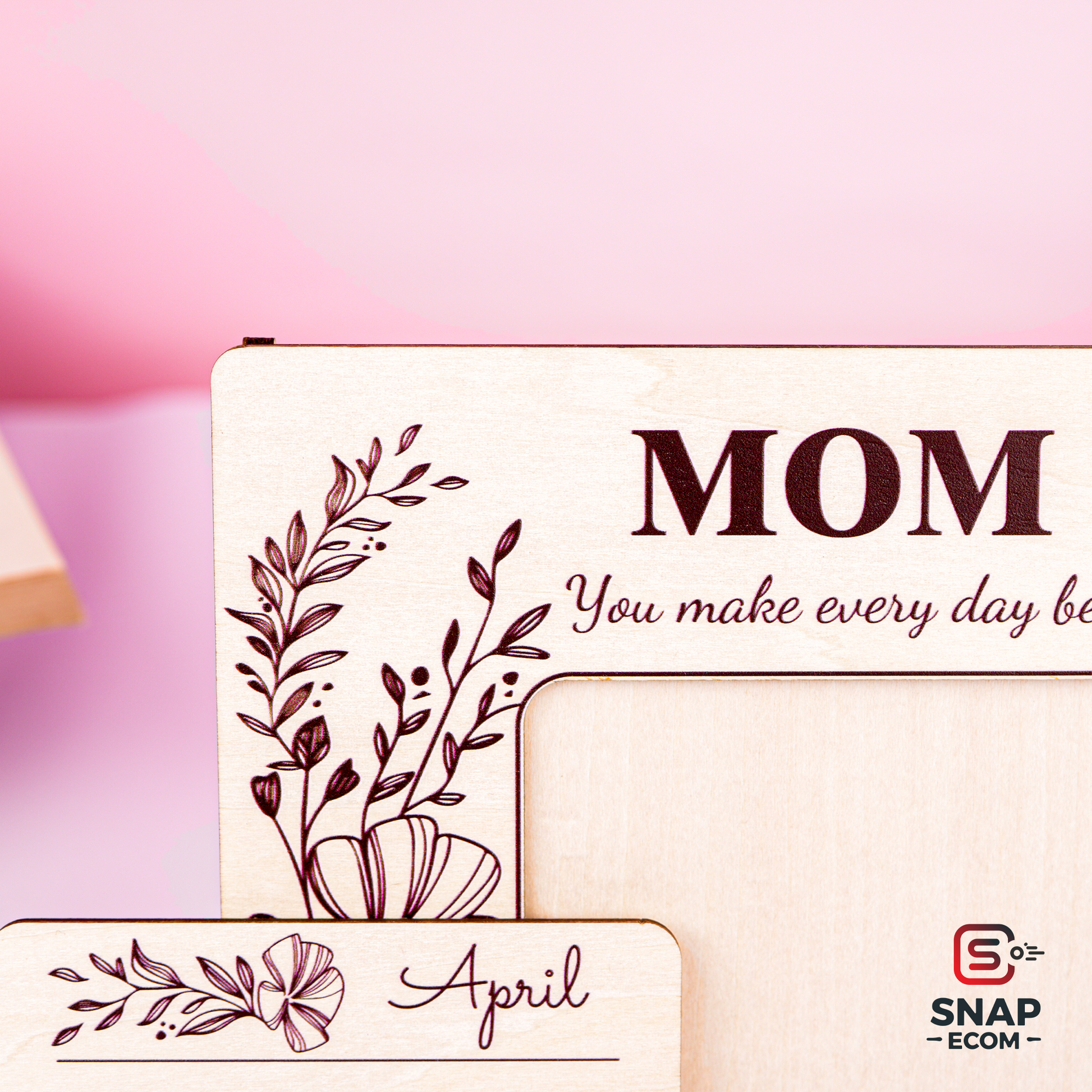 Celebrate the love and warmth of motherhood with this beautifully engraved wooden photo frame featuring a customizable calendar. Designed with delicate floral engravings and the heartfelt message, "MOM, You make every day better," this keepsake is a perfect way to cherish special moments forever.