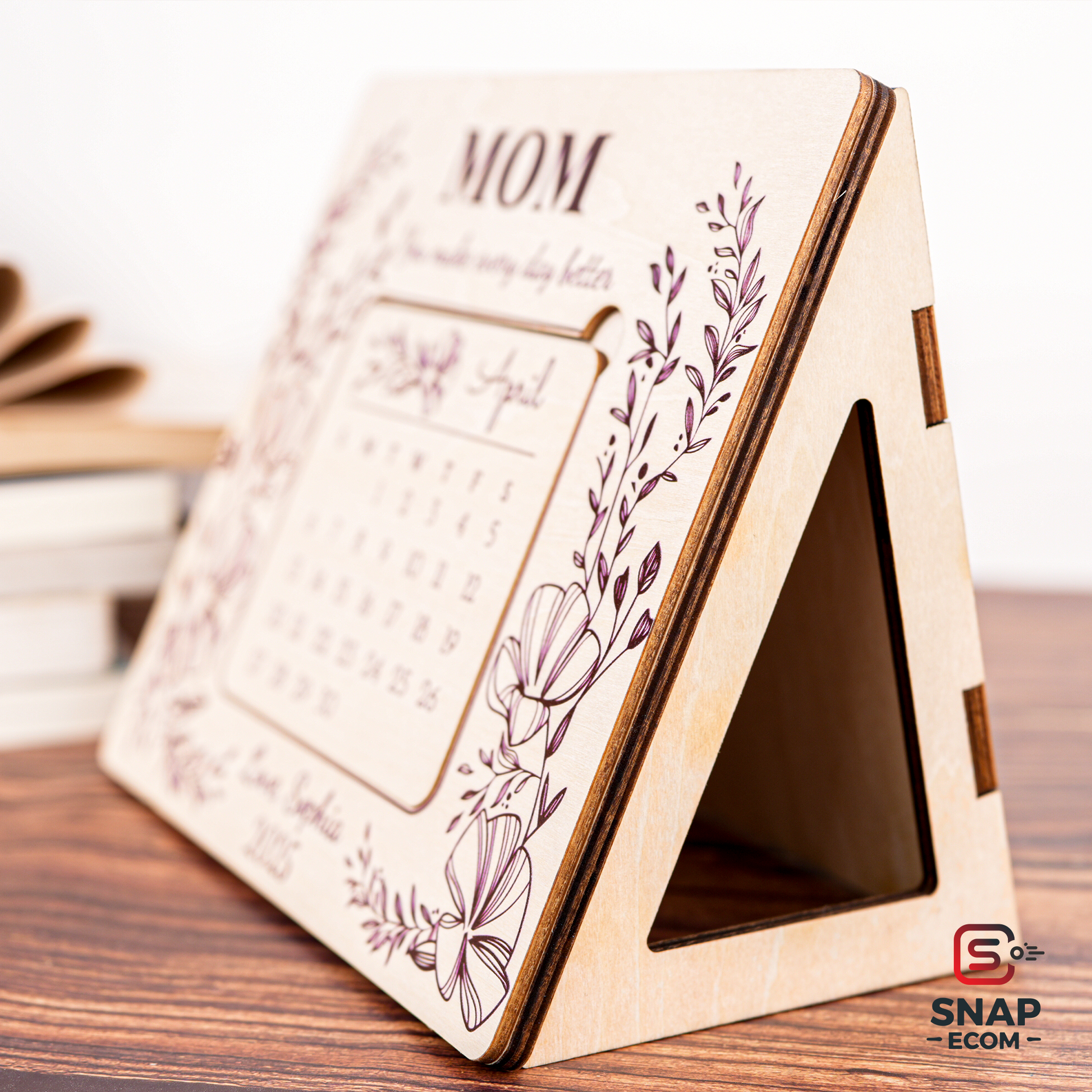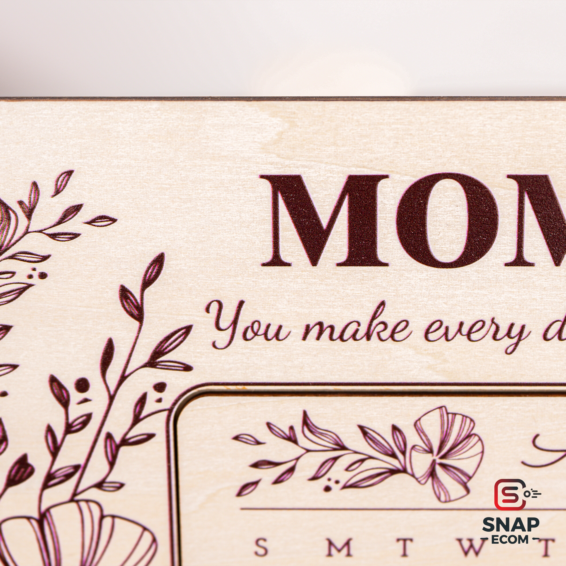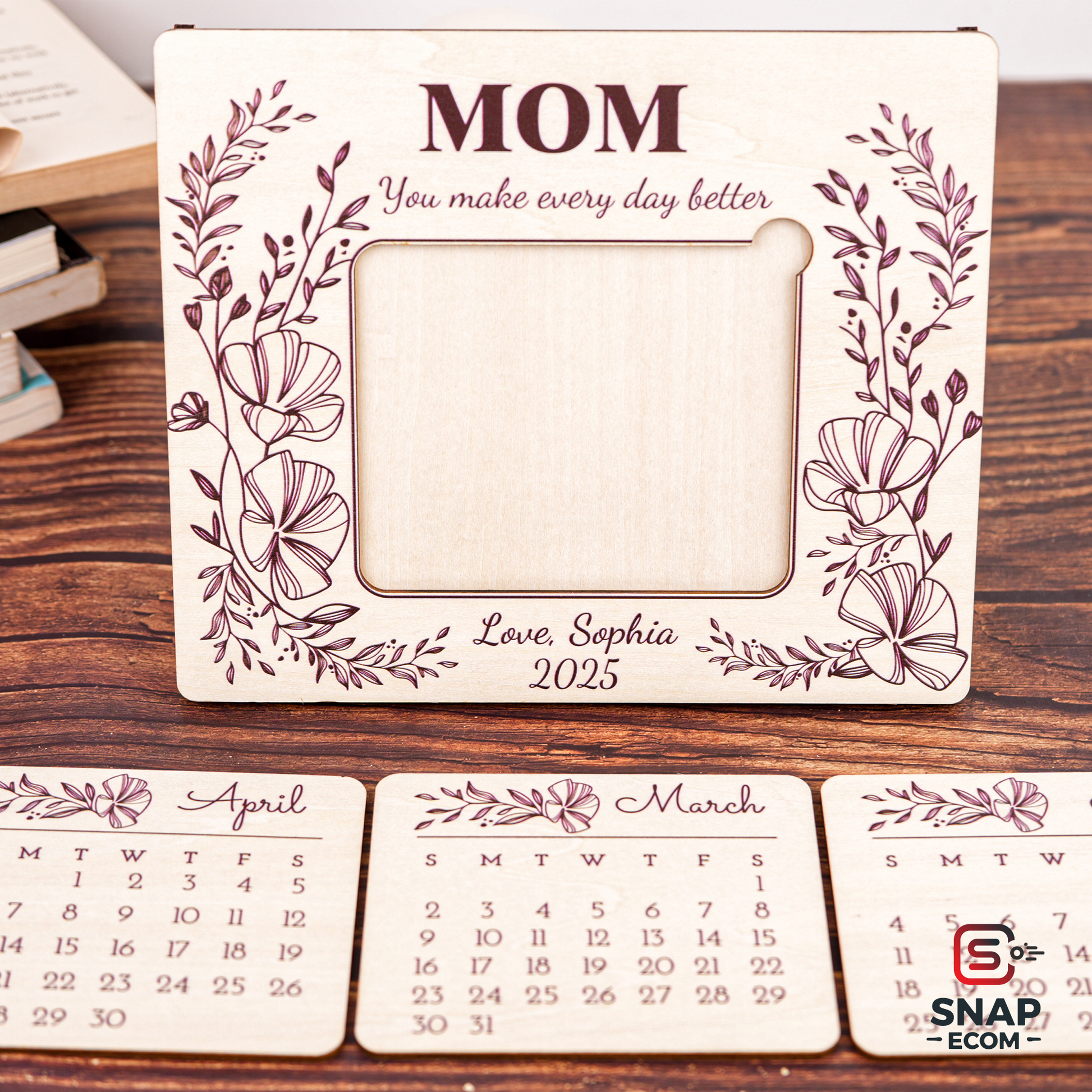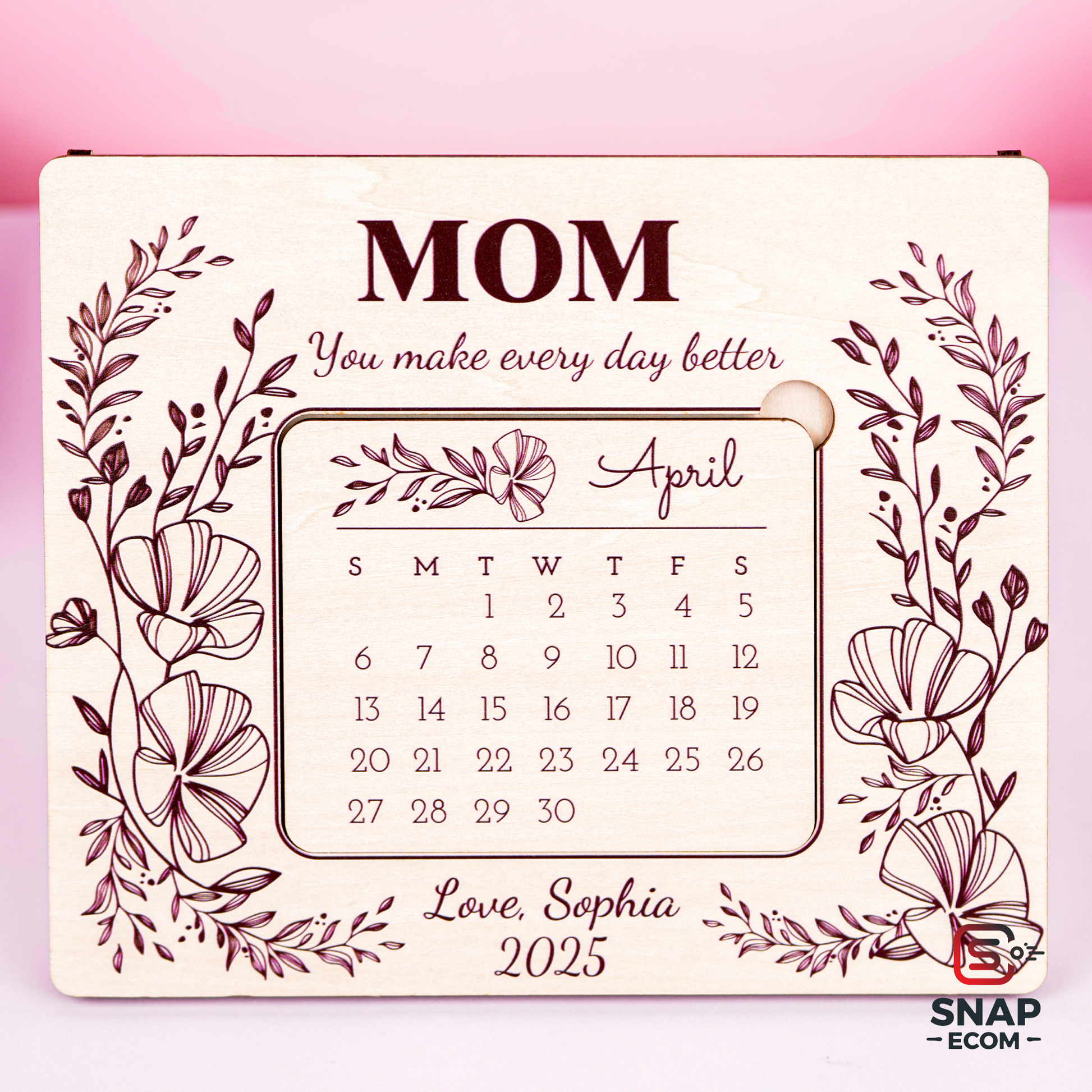 Celebrate the love and warmth of motherhood with this beautifully engraved wooden photo frame featuring a customizable calendar. Designed with delicate floral engravings and the heartfelt message, "MOM, You make every day better," this keepsake is a perfect way to cherish special moments forever.