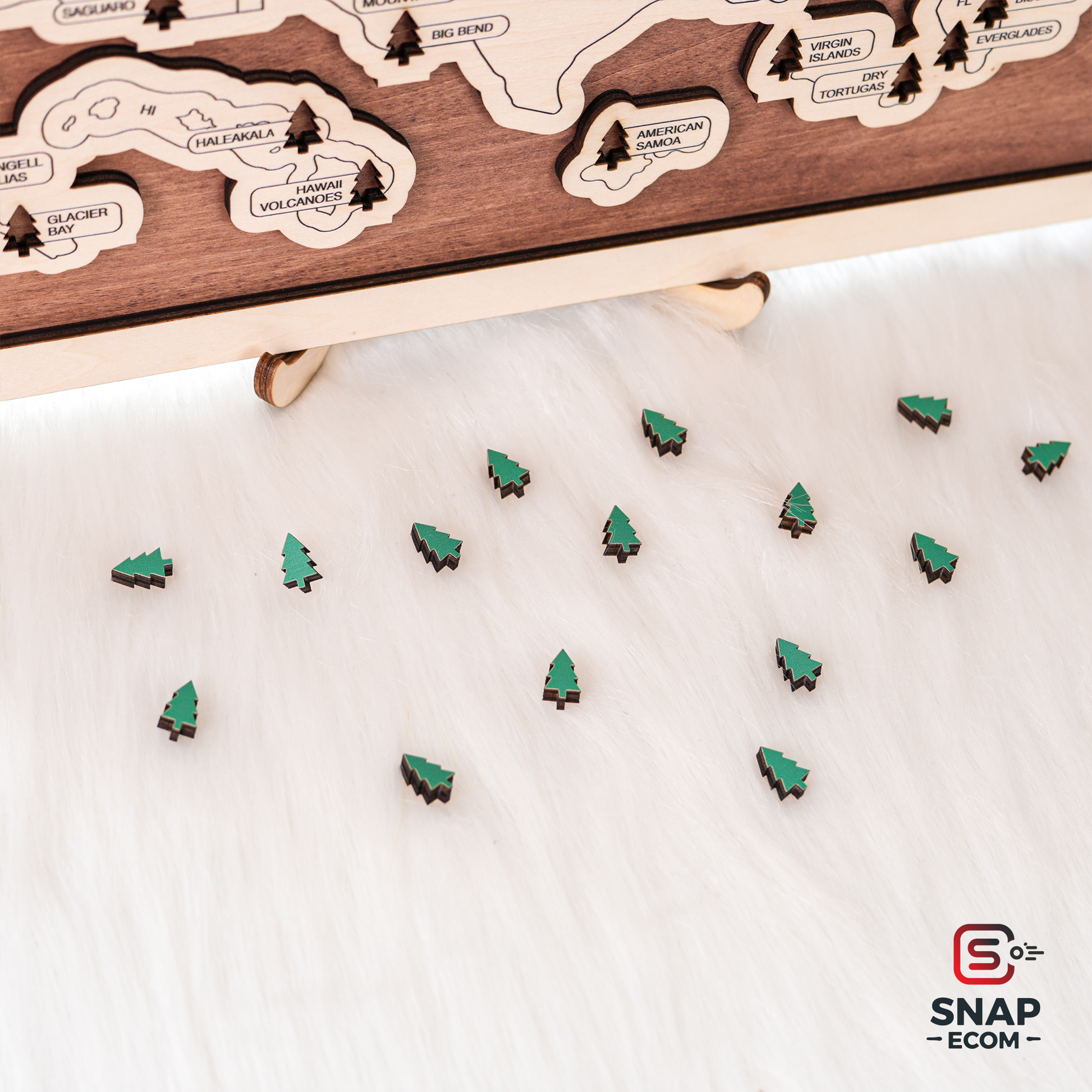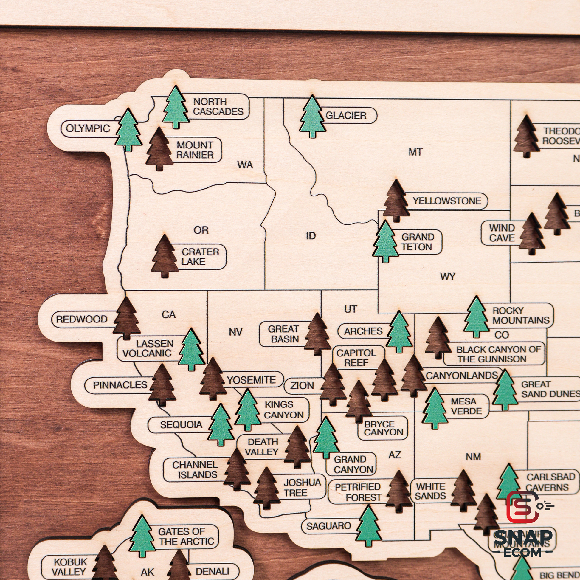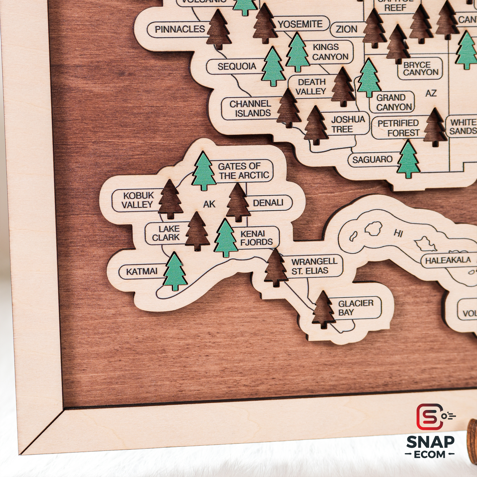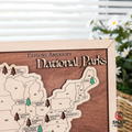 Mark your travels with this beautifully handcrafted National Park Travel Map! Each time you visit a park, place a custom-cut green tree in its designated spot to track your adventures and cherish your memories.