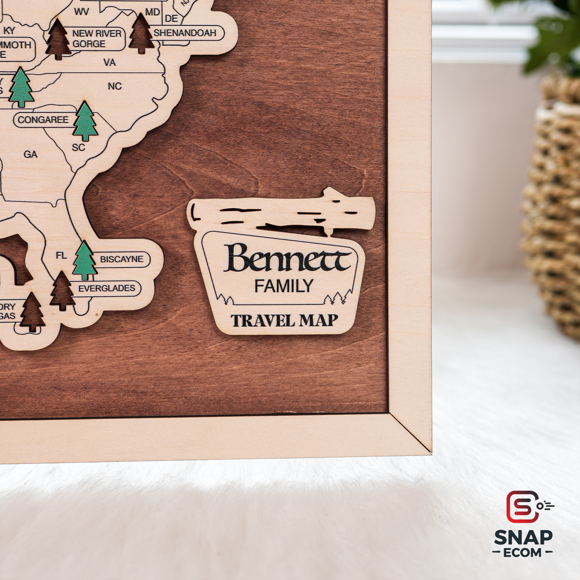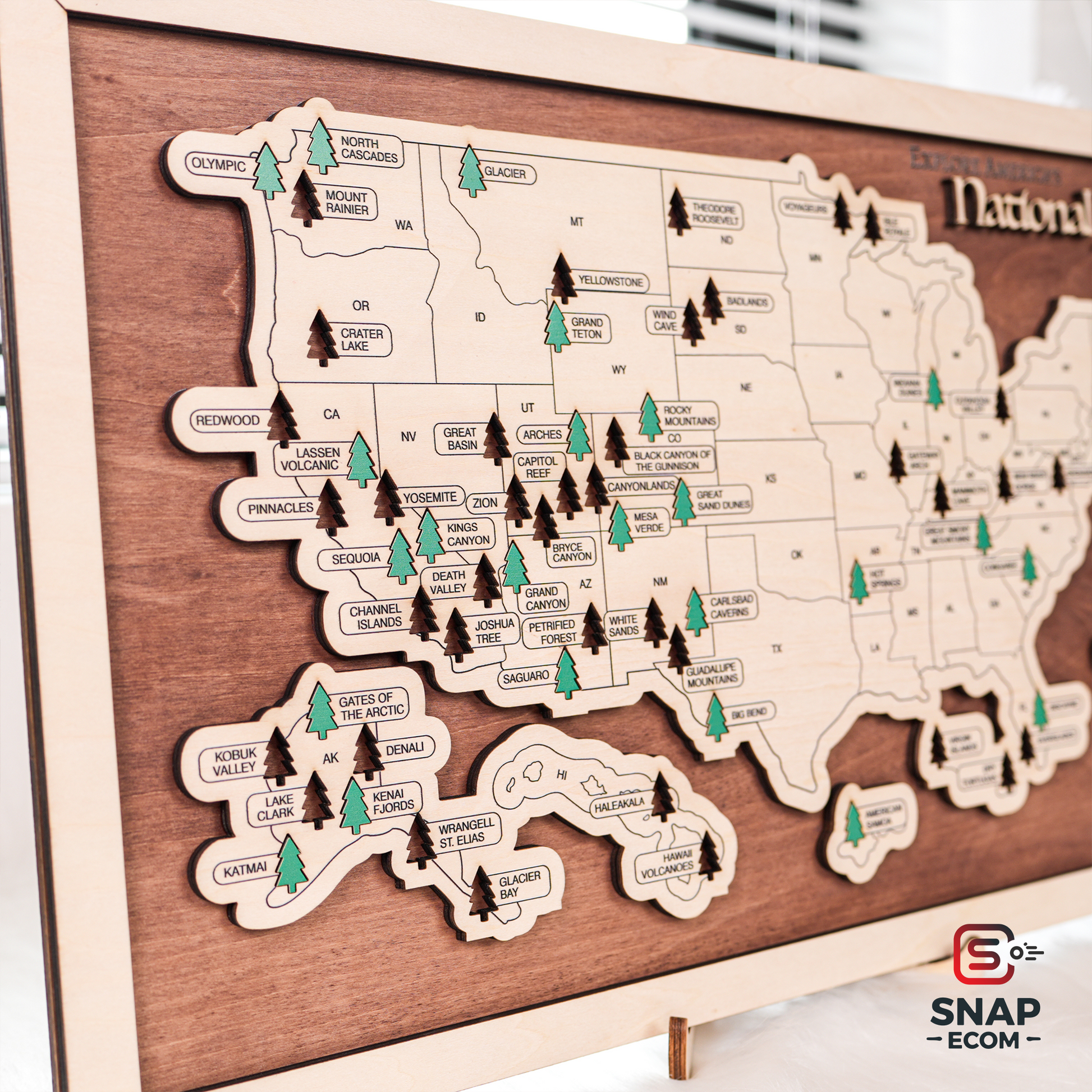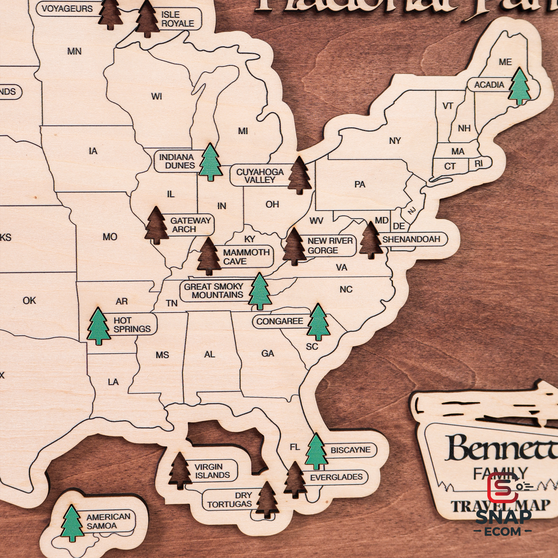 Mark your travels with this beautifully handcrafted National Park Travel Map! Each time you visit a park, place a custom-cut green tree in its designated spot to track your adventures and cherish your memories.