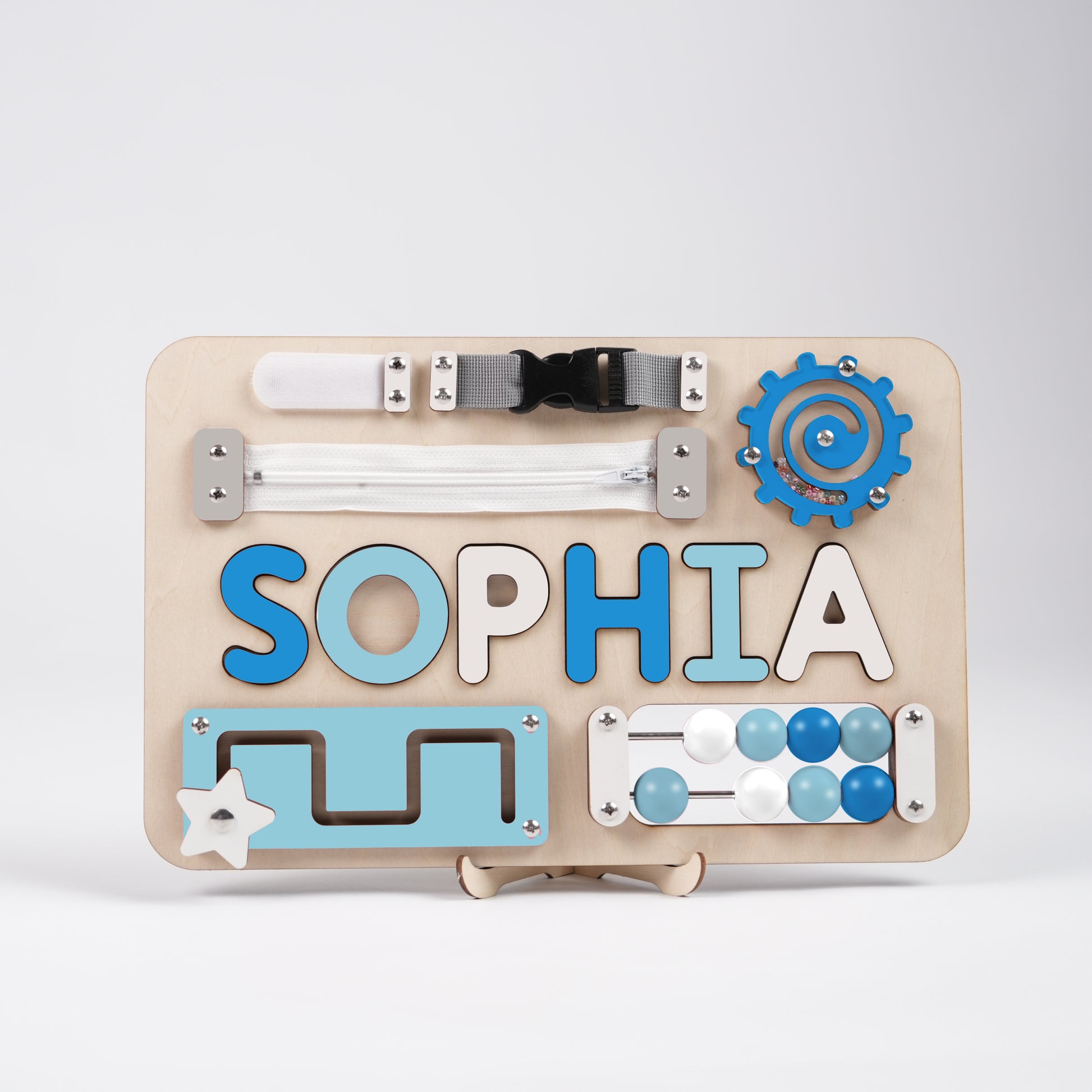 Keywords: Montessori busy board, sensory toy, personalized baby gift, educational toys, toddler name board, plywood toy, custom busy board.
