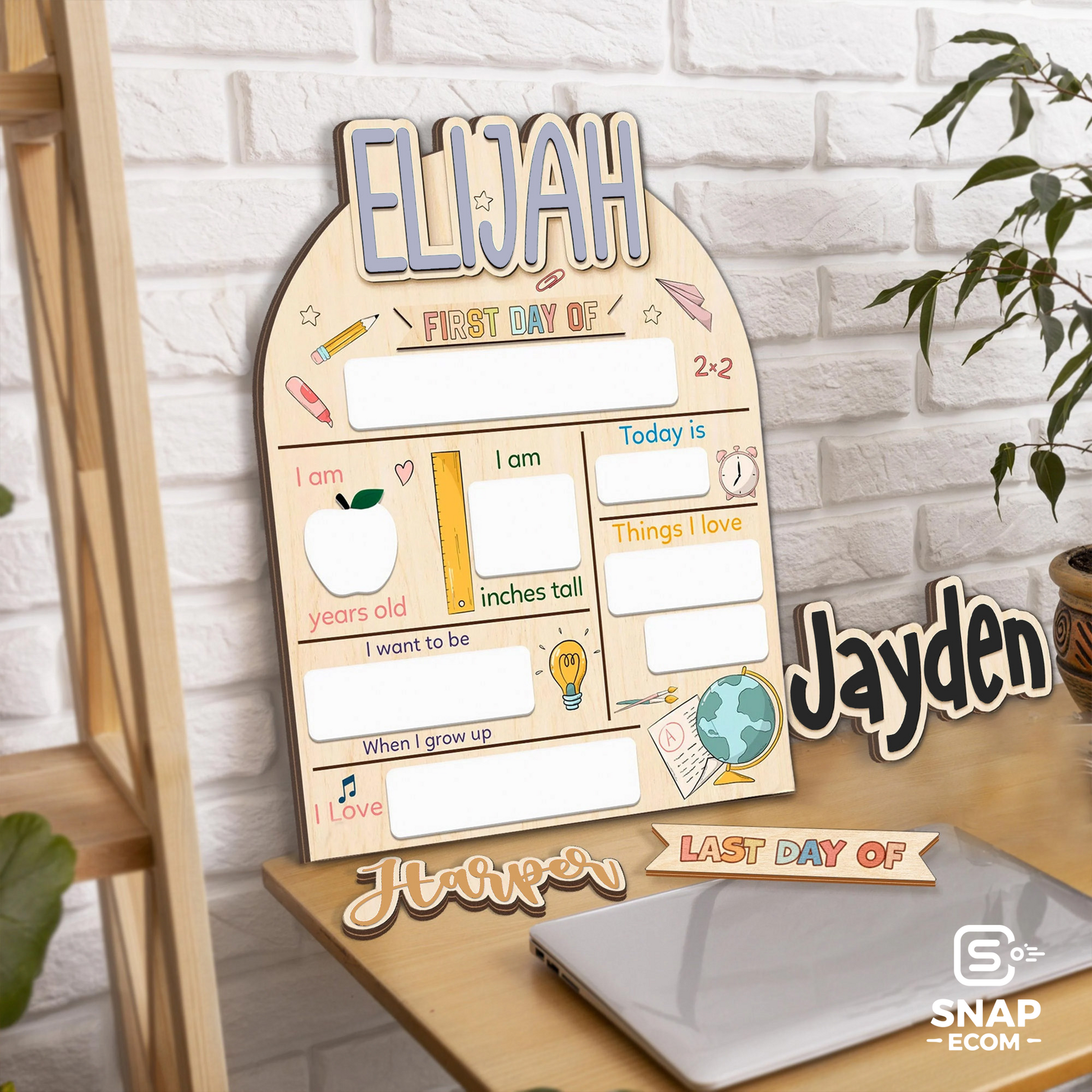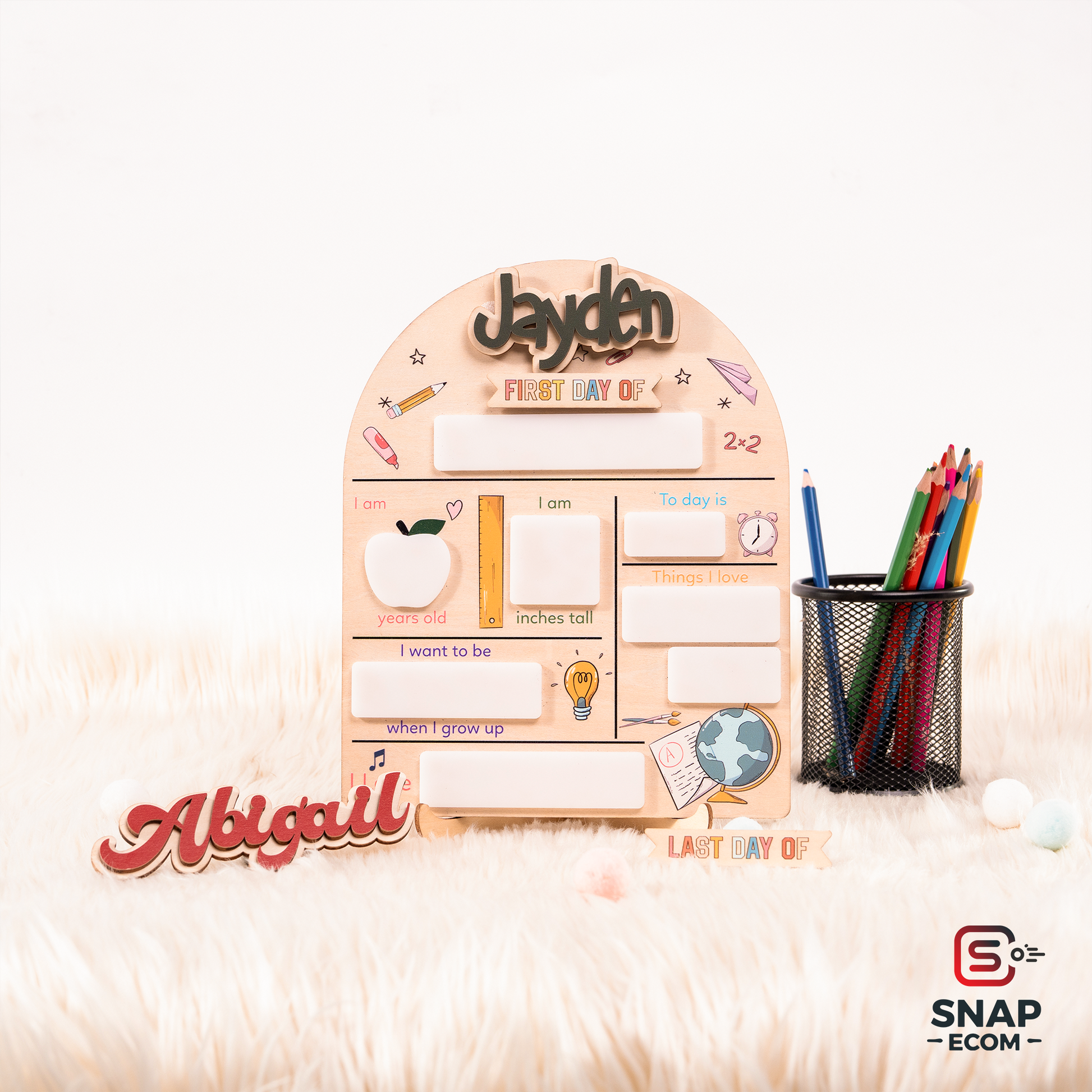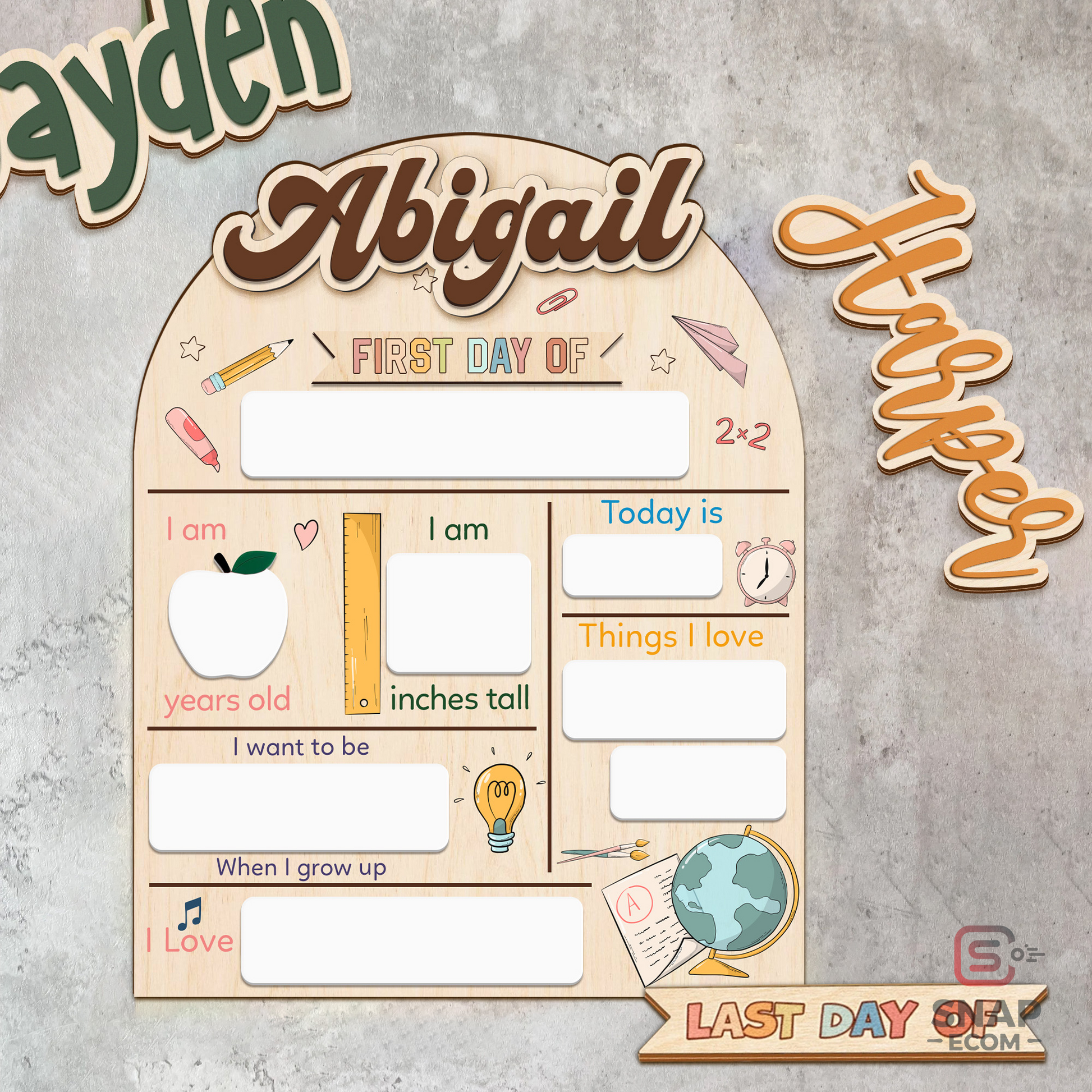 Capture every special moment with our versatile First Day of School Sign, perfect for back-to-school photos, kindergarten memories, and marking both the first and last days of school. Easily customize with interchangeable names and switch between "first day of" and "last day of" for maximum usability.