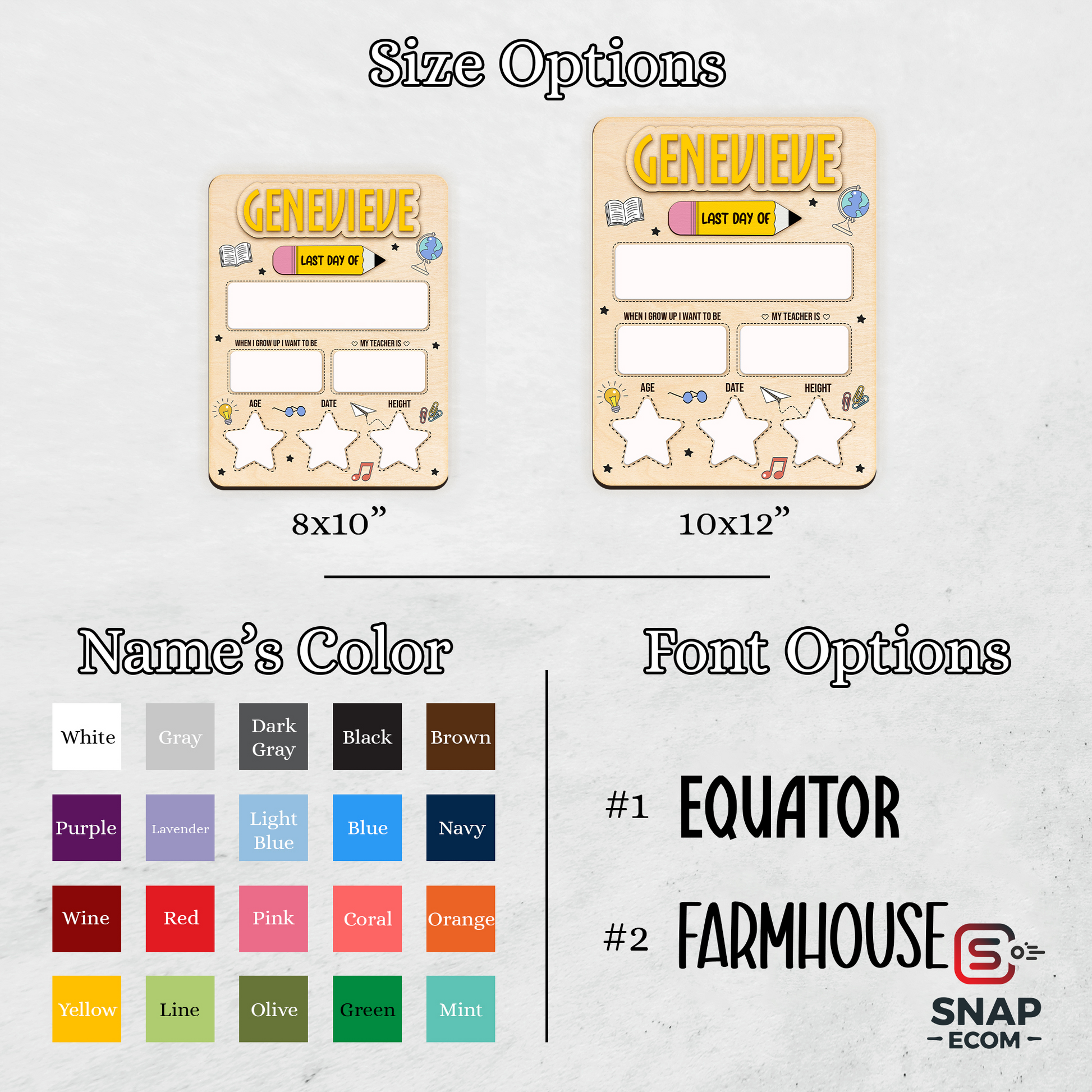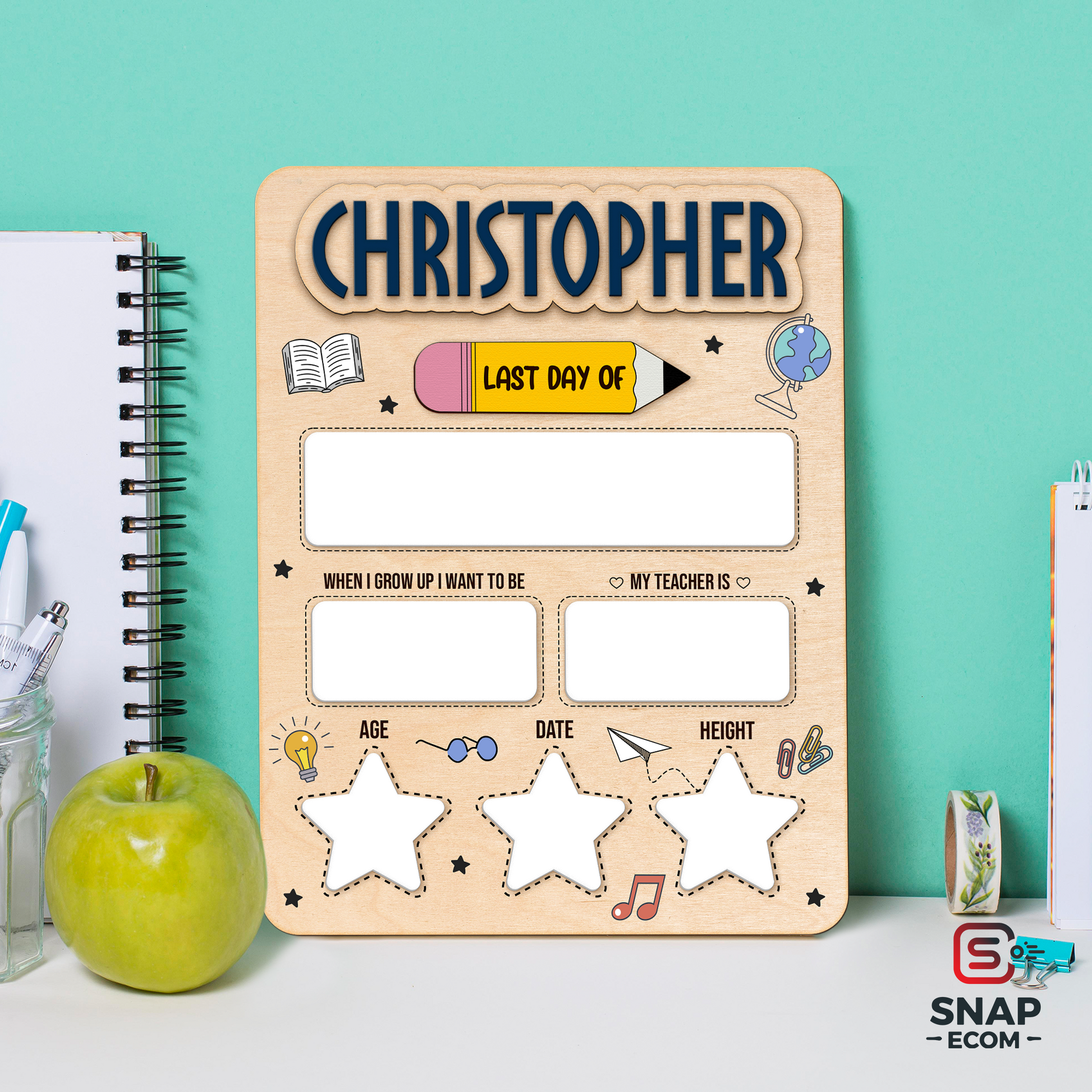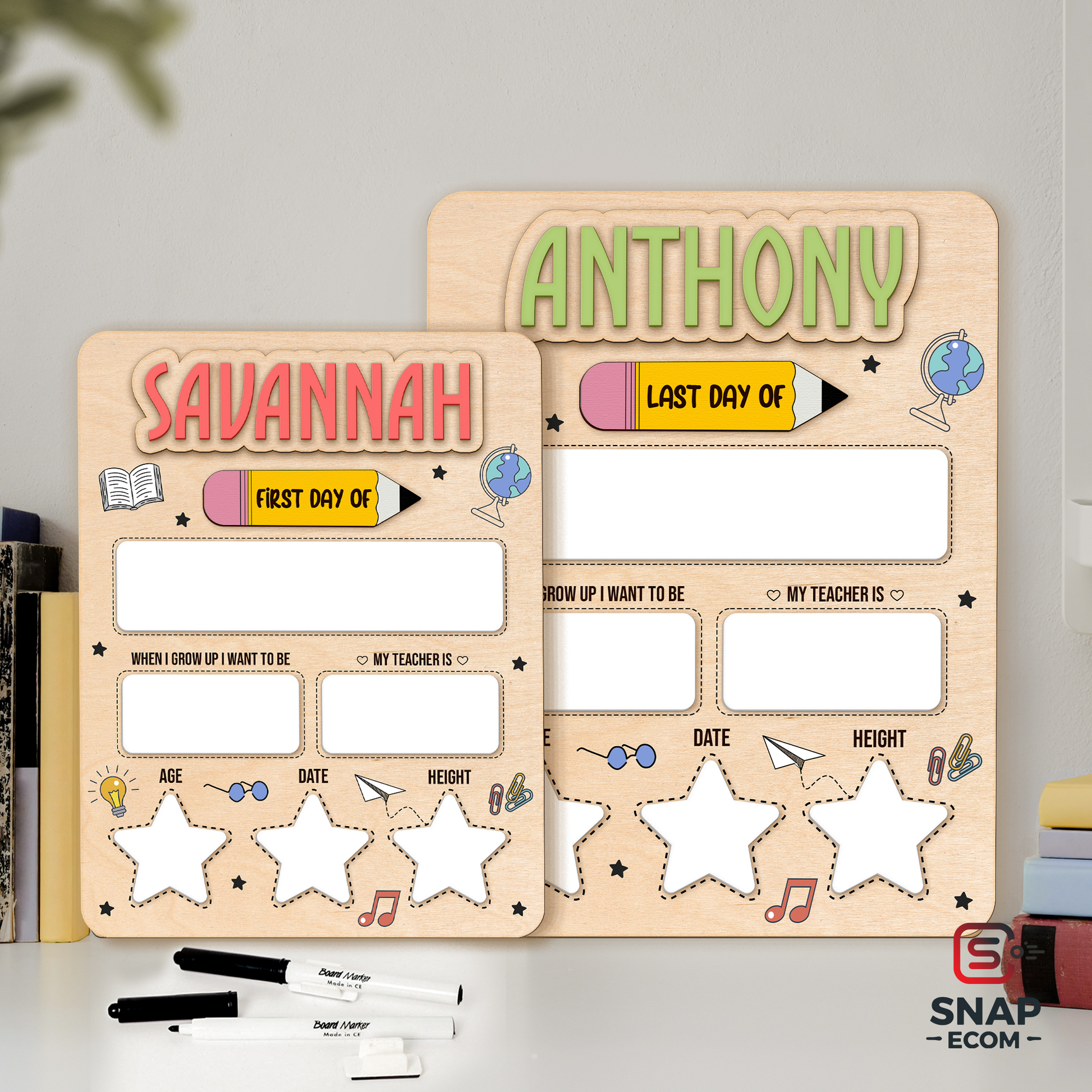 Capture every special moment with our versatile First Day of School Sign, perfect for back-to-school photos, kindergarten memories, and marking both the first and last days of school. Easily customize with interchangeable names and switch between "first day of" and "last day of" for maximum usability.